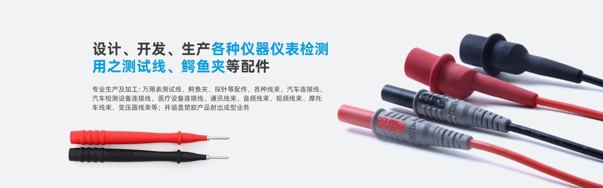 东莞市世仪电子有限公司是一家专业从事各种仪器仪表检测用之测试线、鳄鱼夹等配件的设计、开发、生产的多元化公司,主要以OEM为主。本公司专业生产及加工: 万用表测试线、鳄鱼夹、探针等配件,各种线束、汽车连接线、汽车检测设备 连接线、医疗设备连接线、通讯线束、音频线束、视频线束、摩托车线束、变压器线束等;并涵盖塑胶产品 射出成型业务。东莞市嘉沛泰电子有限公司设在广东省东莞市虎门镇,拥有二十多年专业开发经验的工程人员,具有完 整、科学的质量管理体系。本公司的诚信、实力和产品质量获得业界的认可,部分产品已取得CE、UL、ETL认证。